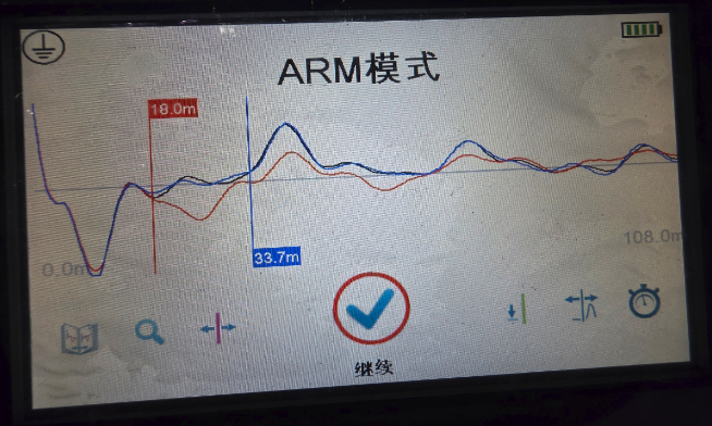 在ARM模式下,发现该密集母线测试全长33.7m,加压后,红蓝波形在18m处出现明显分叉点,此处即为故障点,预定位为下图: