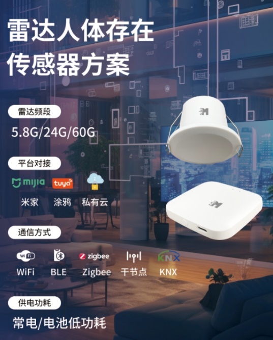 人体存在雷达传感器,支持人体存在检测、测距、环境自学习、分段阈值、APP调节参数、区域划分、多目标跟踪等功能,通过自研算法极致提升产品体验,做到人体存在检测高准确率,低误报率,抗干扰能力强,有效提高窗帘、风扇等干扰源的误触,广泛运用智能家居、酒店、办公等场所,打通米家、涂鸦、华为鸿蒙平台,通讯方式支持WIFI、蓝牙、Zigbee和干节等。