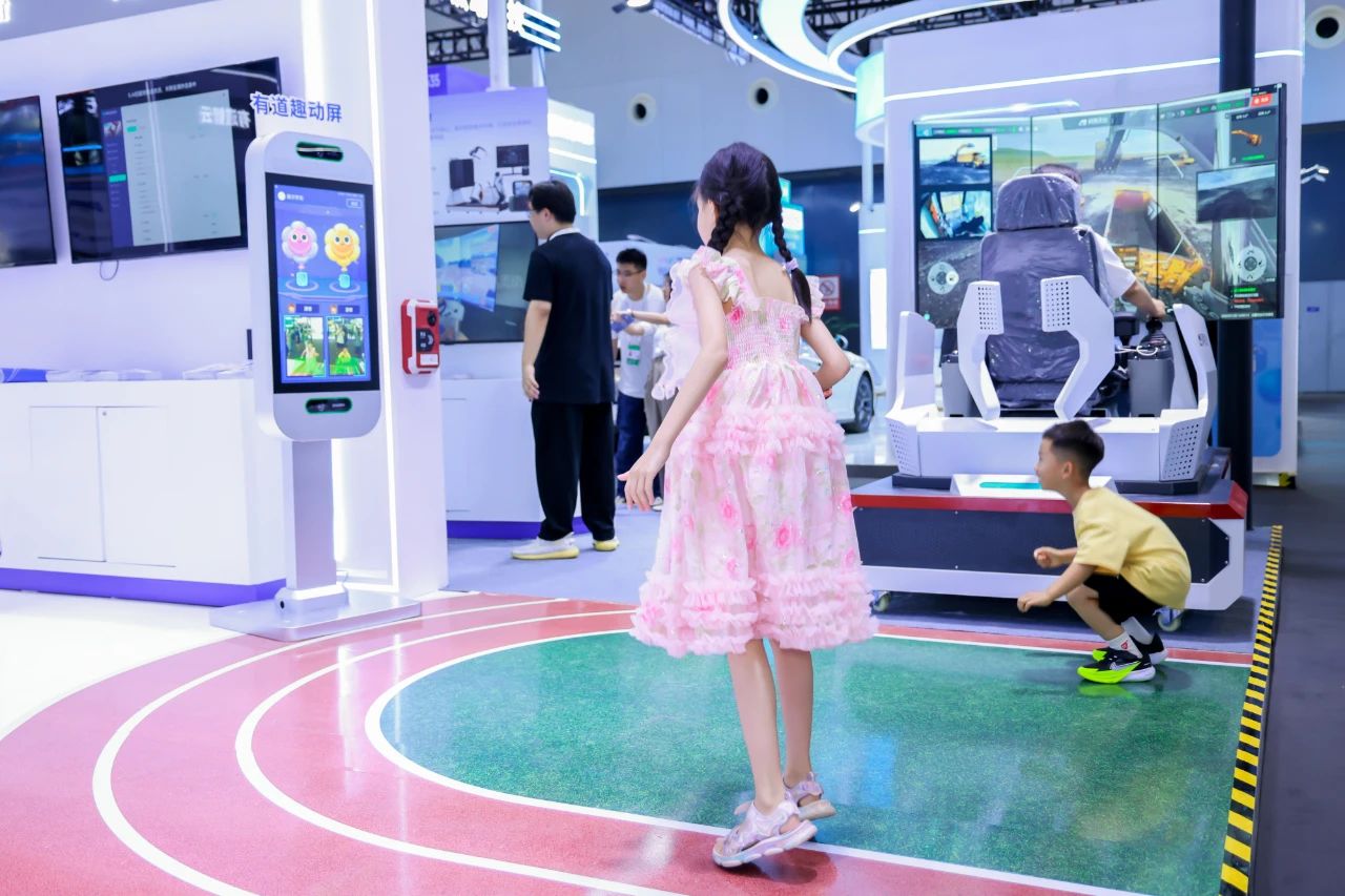 有道趣动屏吸引了很多孩子的驻足,孩子们可以自主操作有道趣动屏选择自己感兴趣的运动体验产品,也能选择趣味运动和小伙伴PK,现场欢声笑语不断。